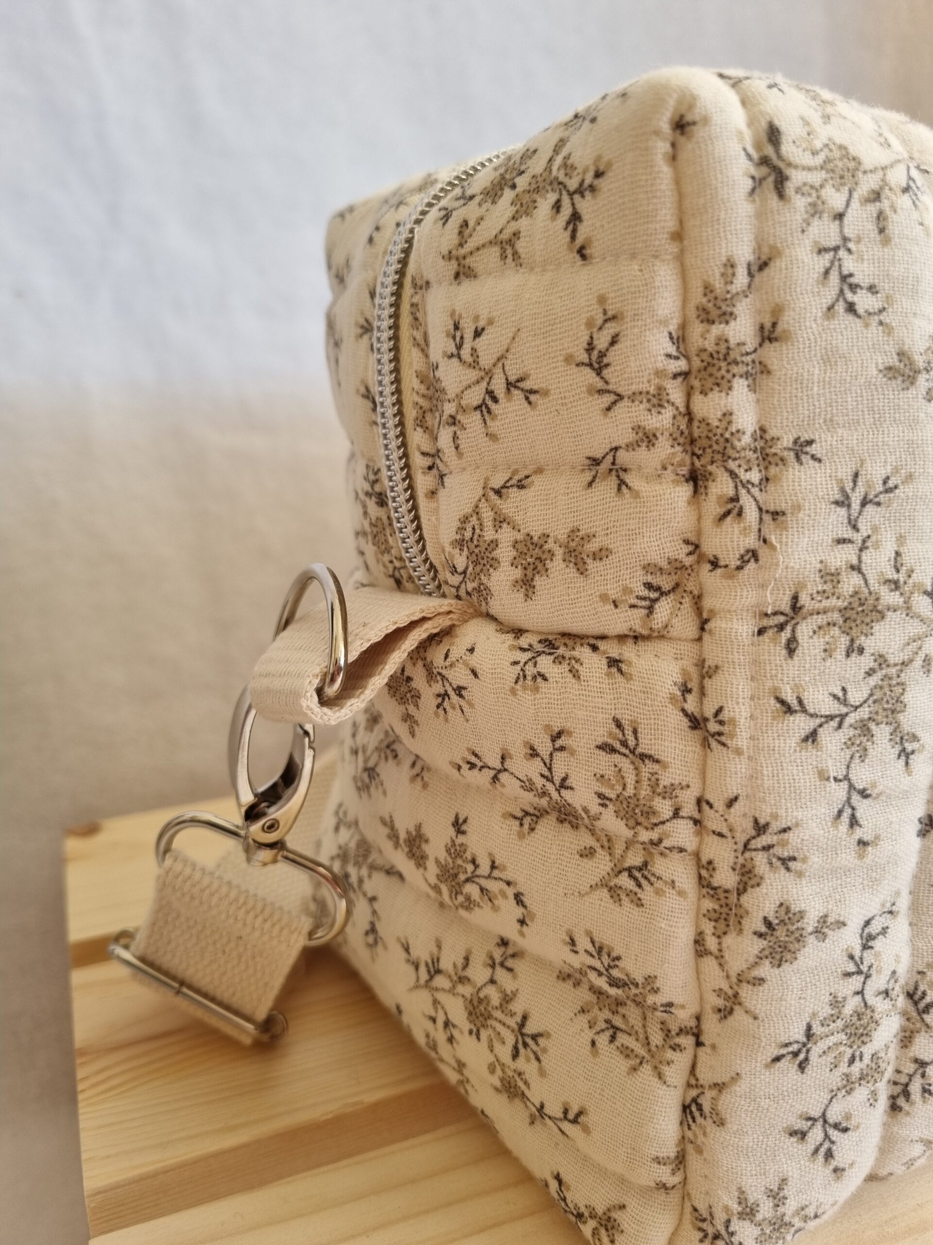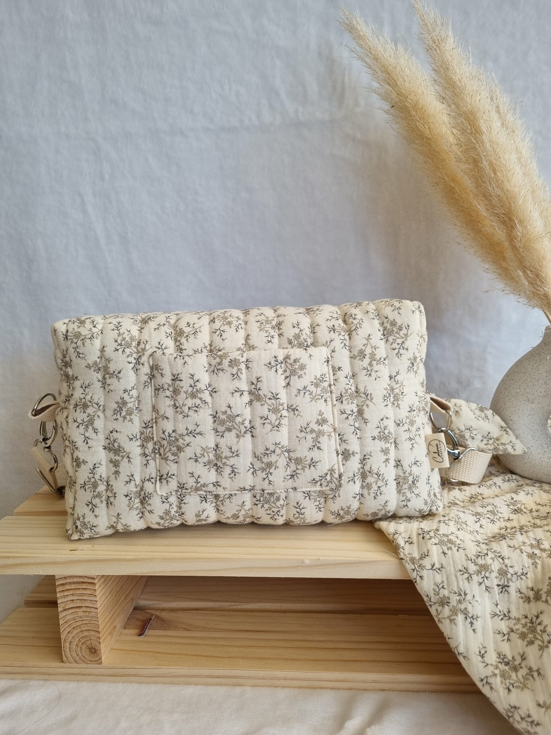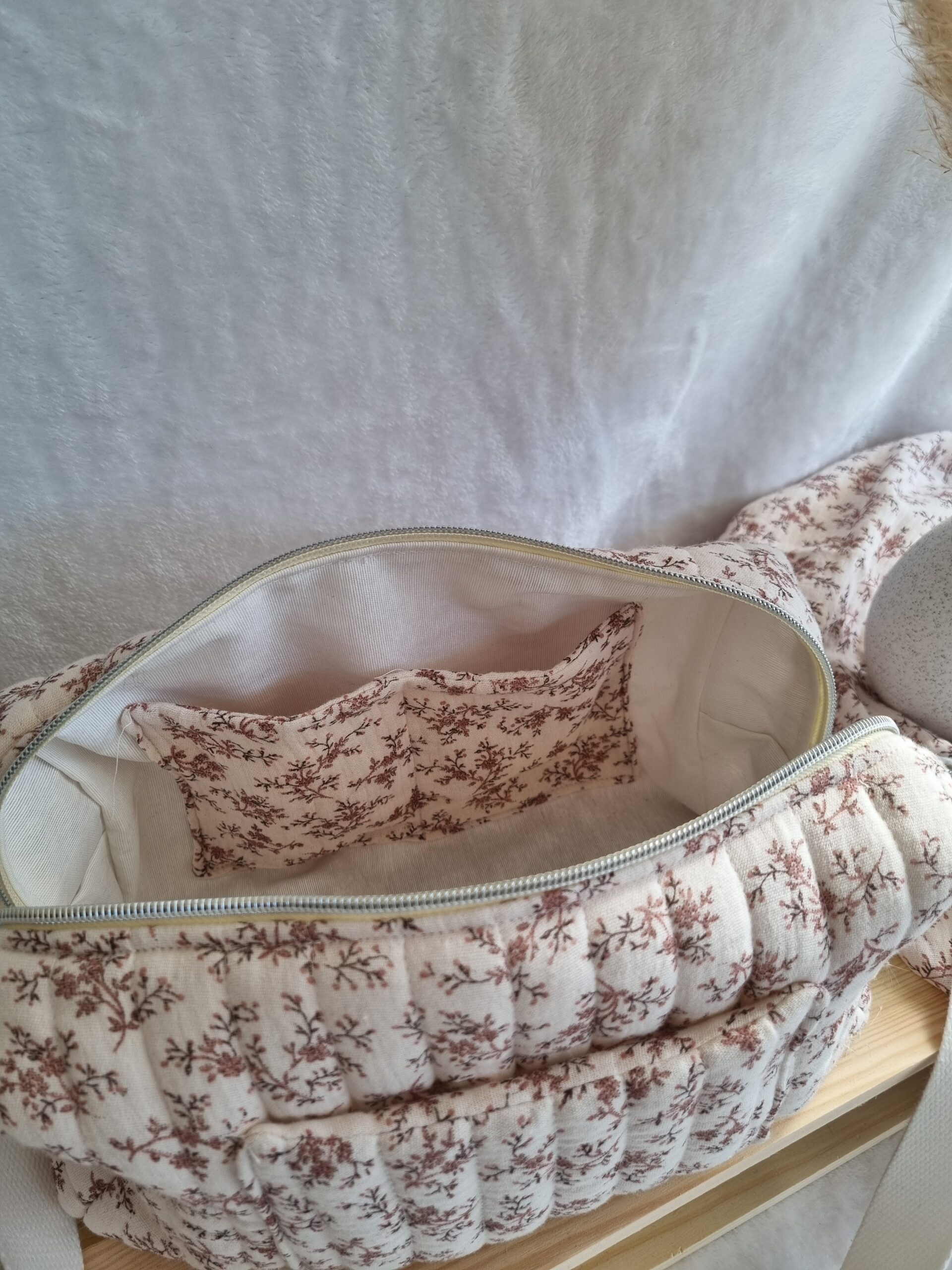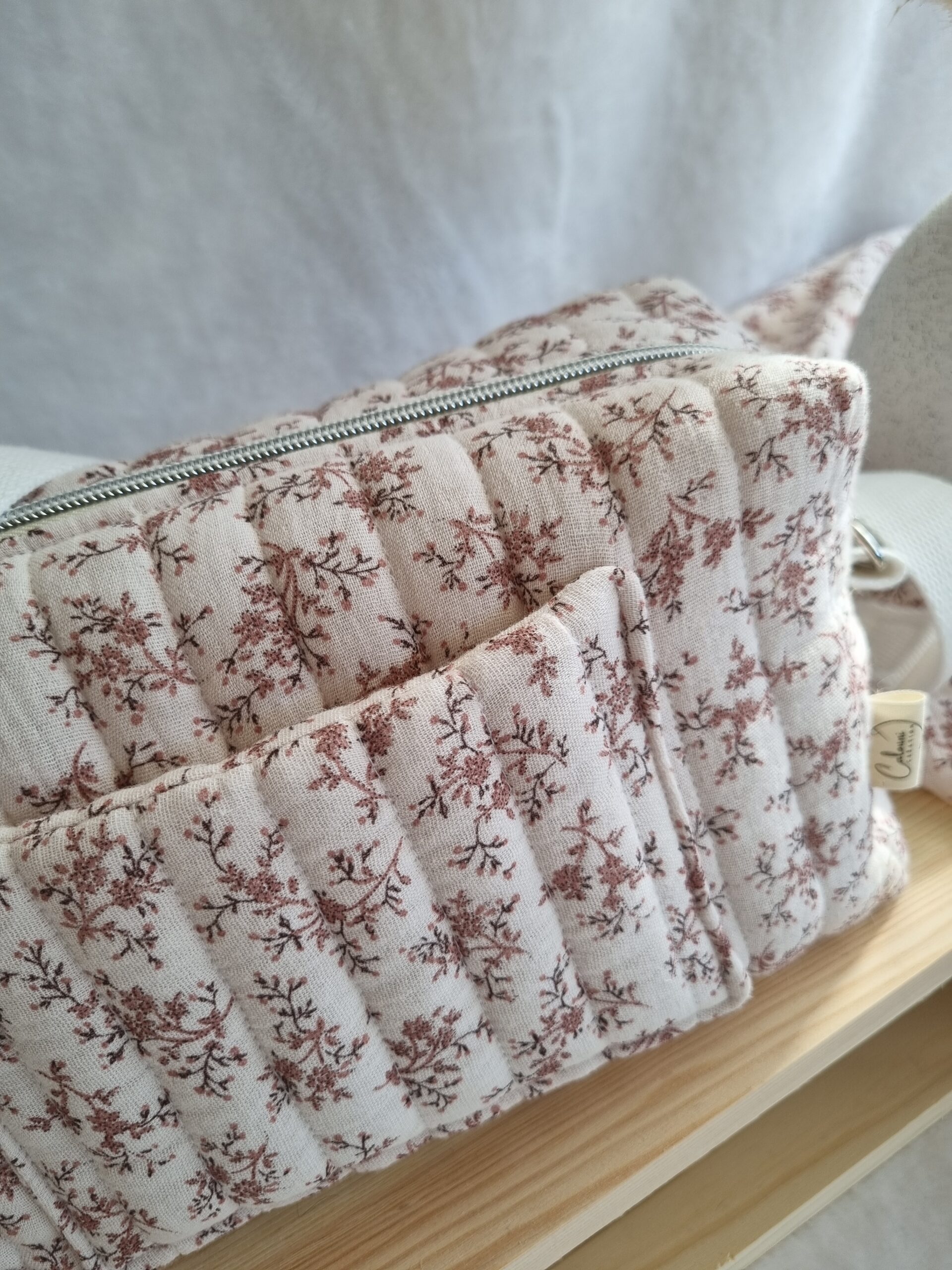 Le motif extérieur est en double gaze de coton et l’intérieur en tissu tissé enduit. Elle est matelassée pour une bonne tenue, elle est fermée par fermeture éclair.