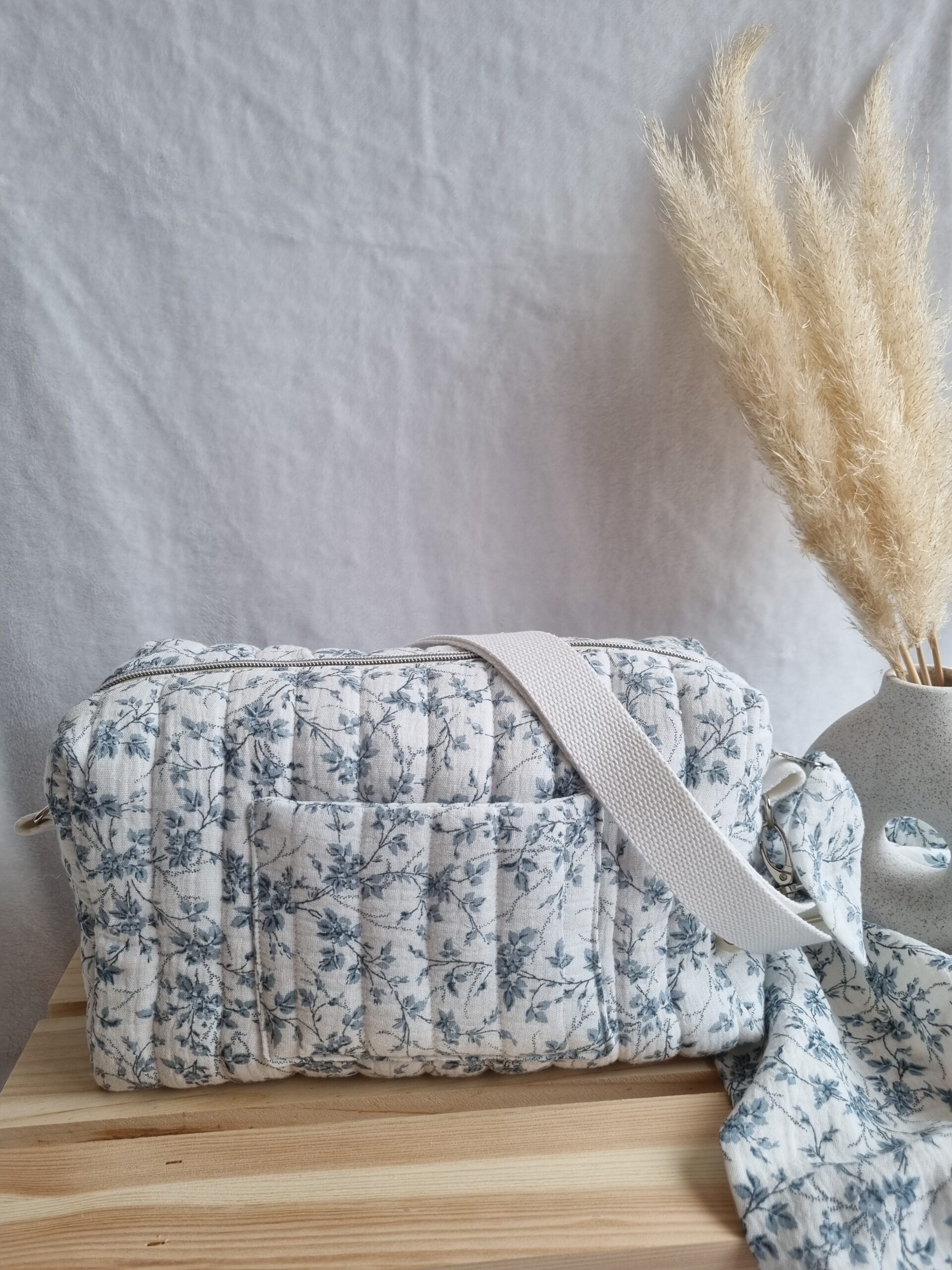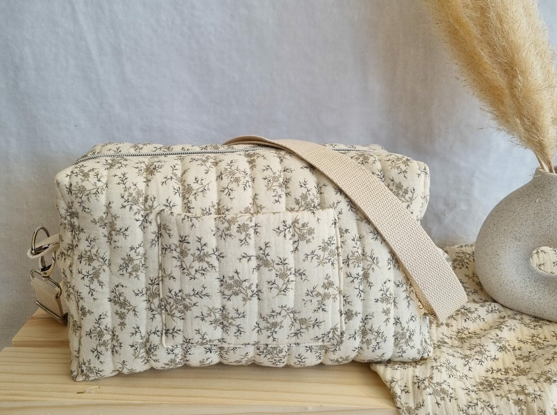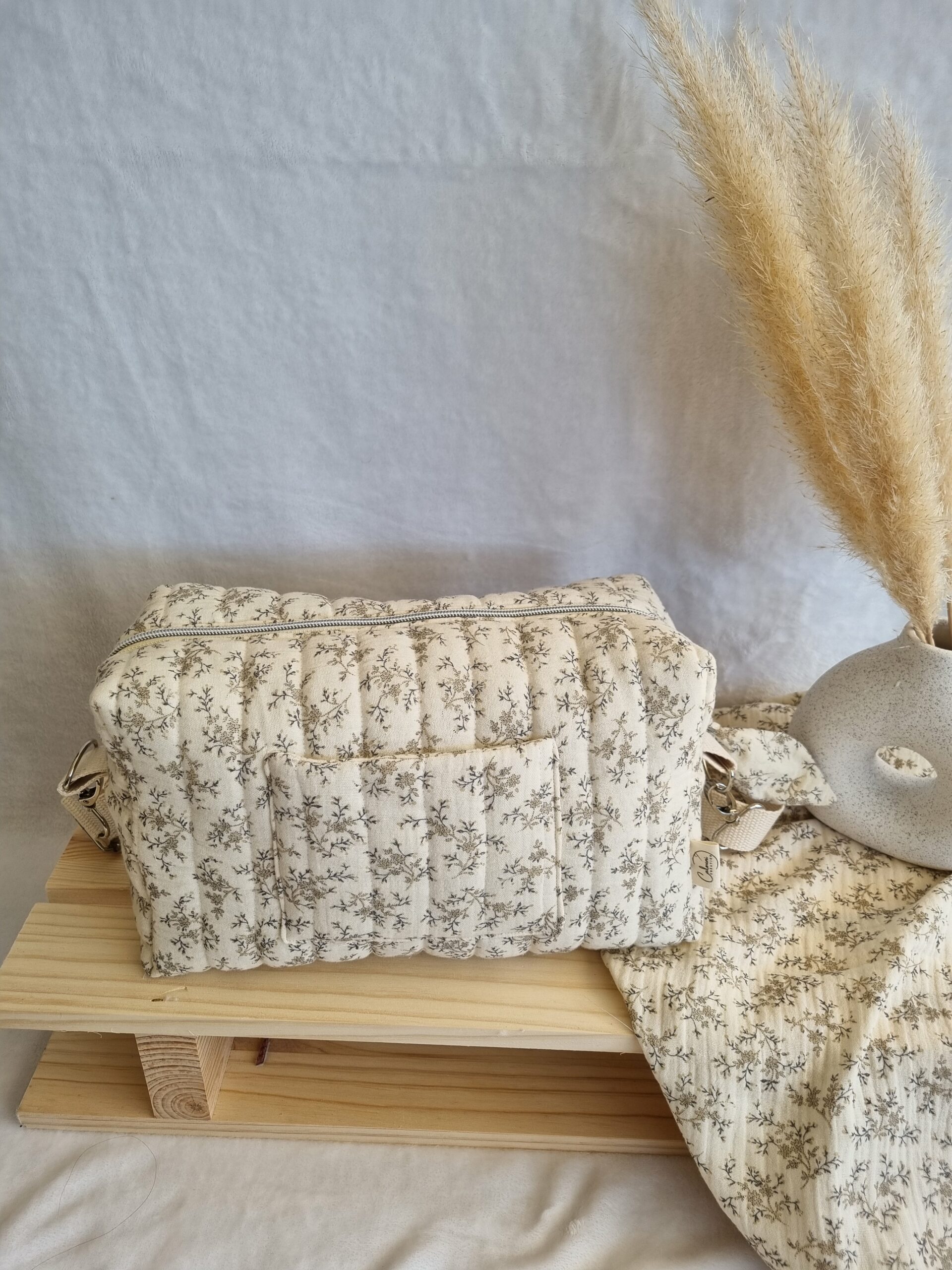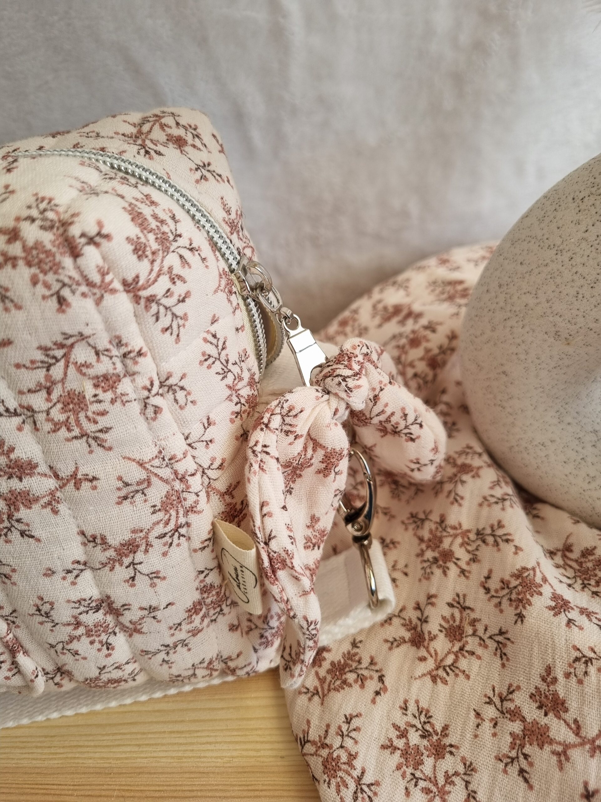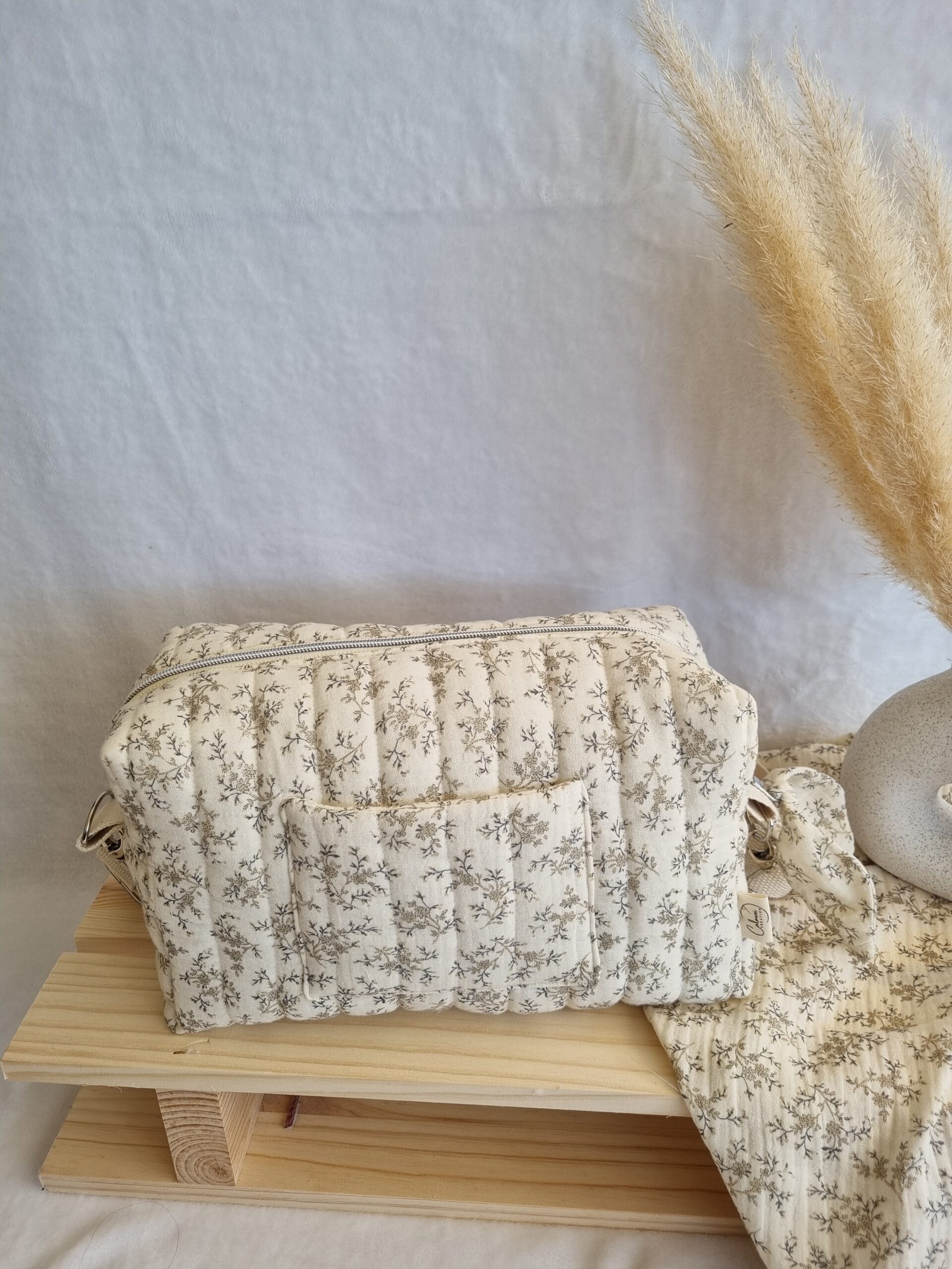 Le motif extérieur est en double gaze de coton et l’intérieur en tissu tissé enduit. Elle est matelassée pour une bonne tenue, elle est fermée par fermeture éclair.