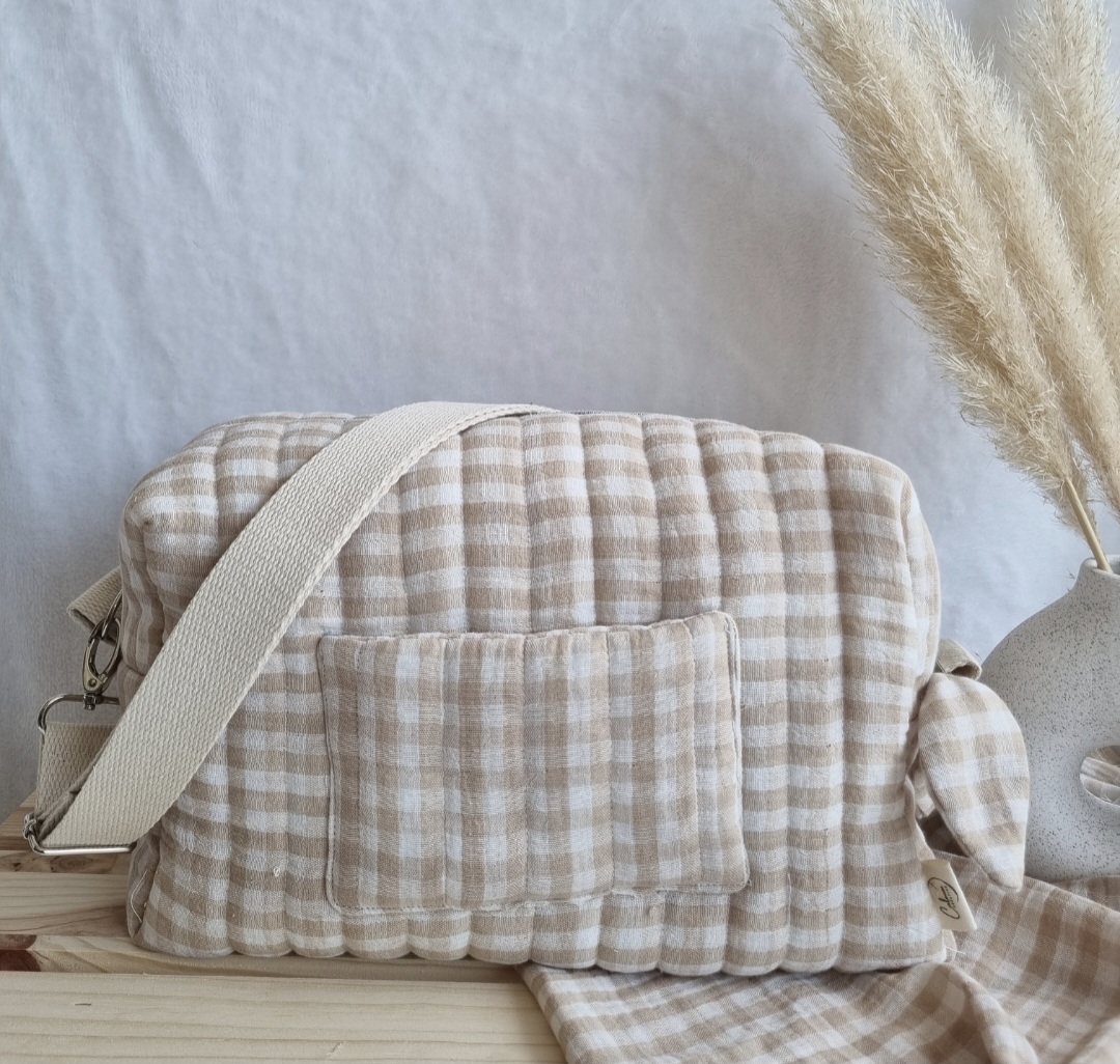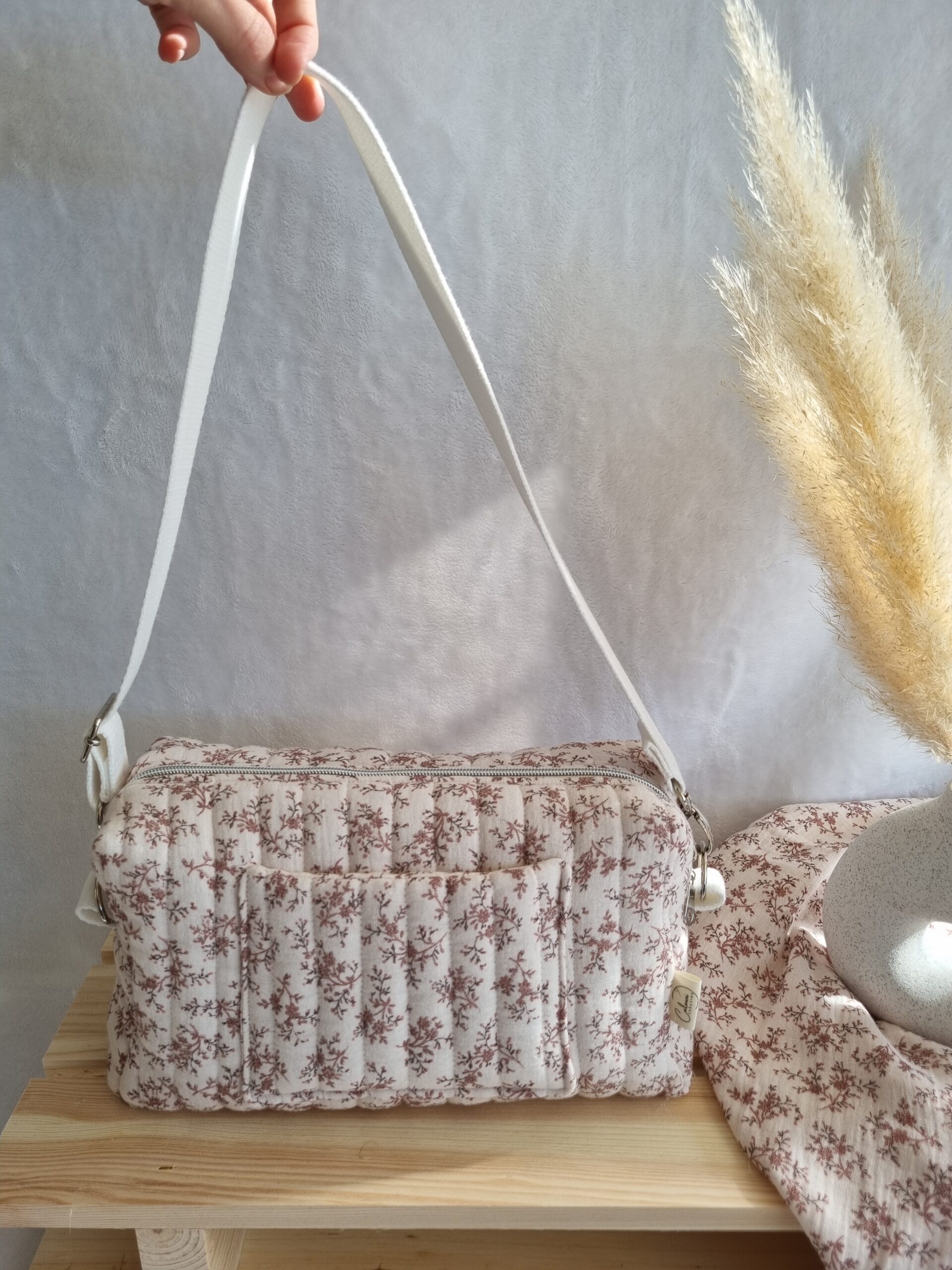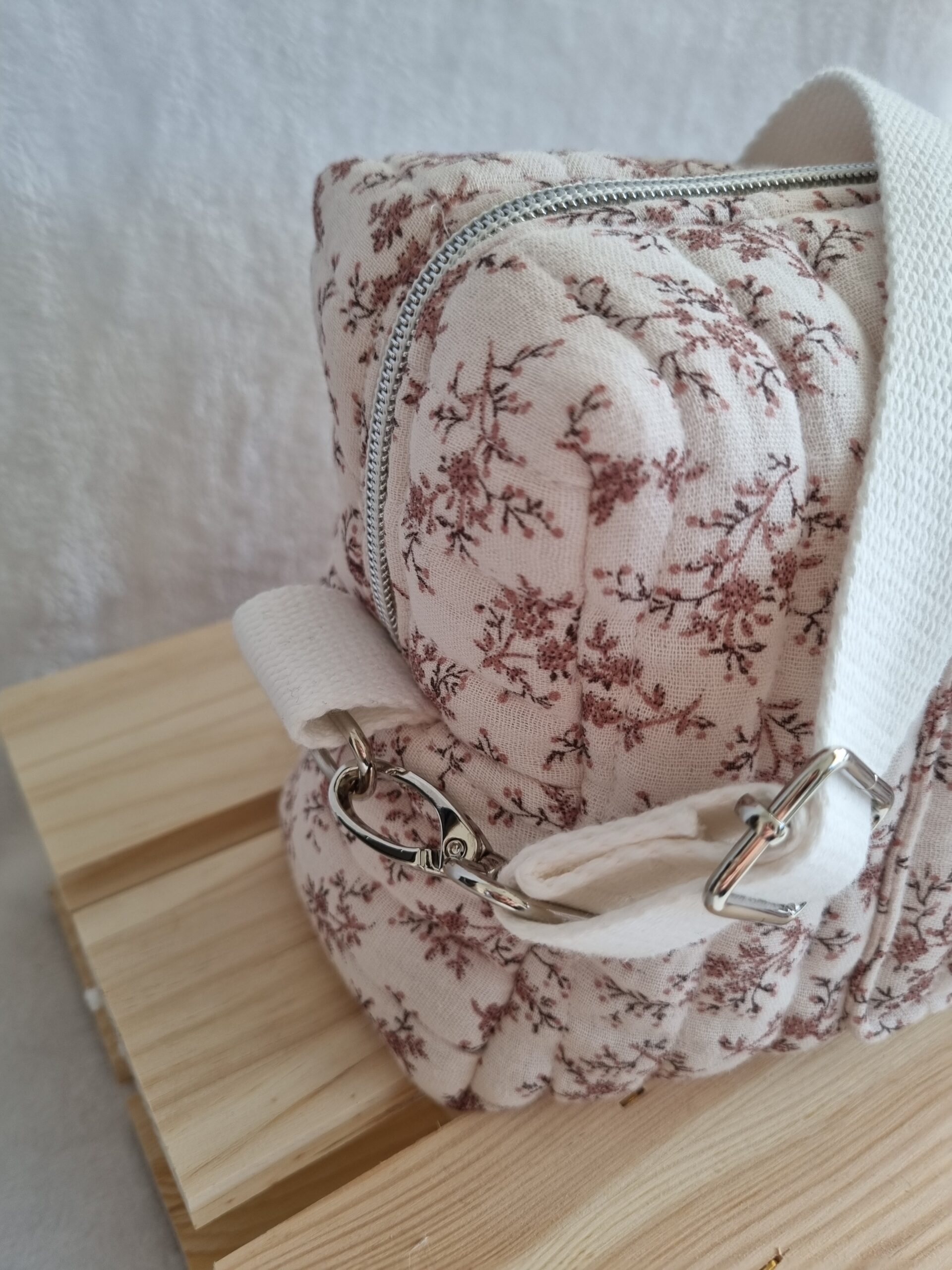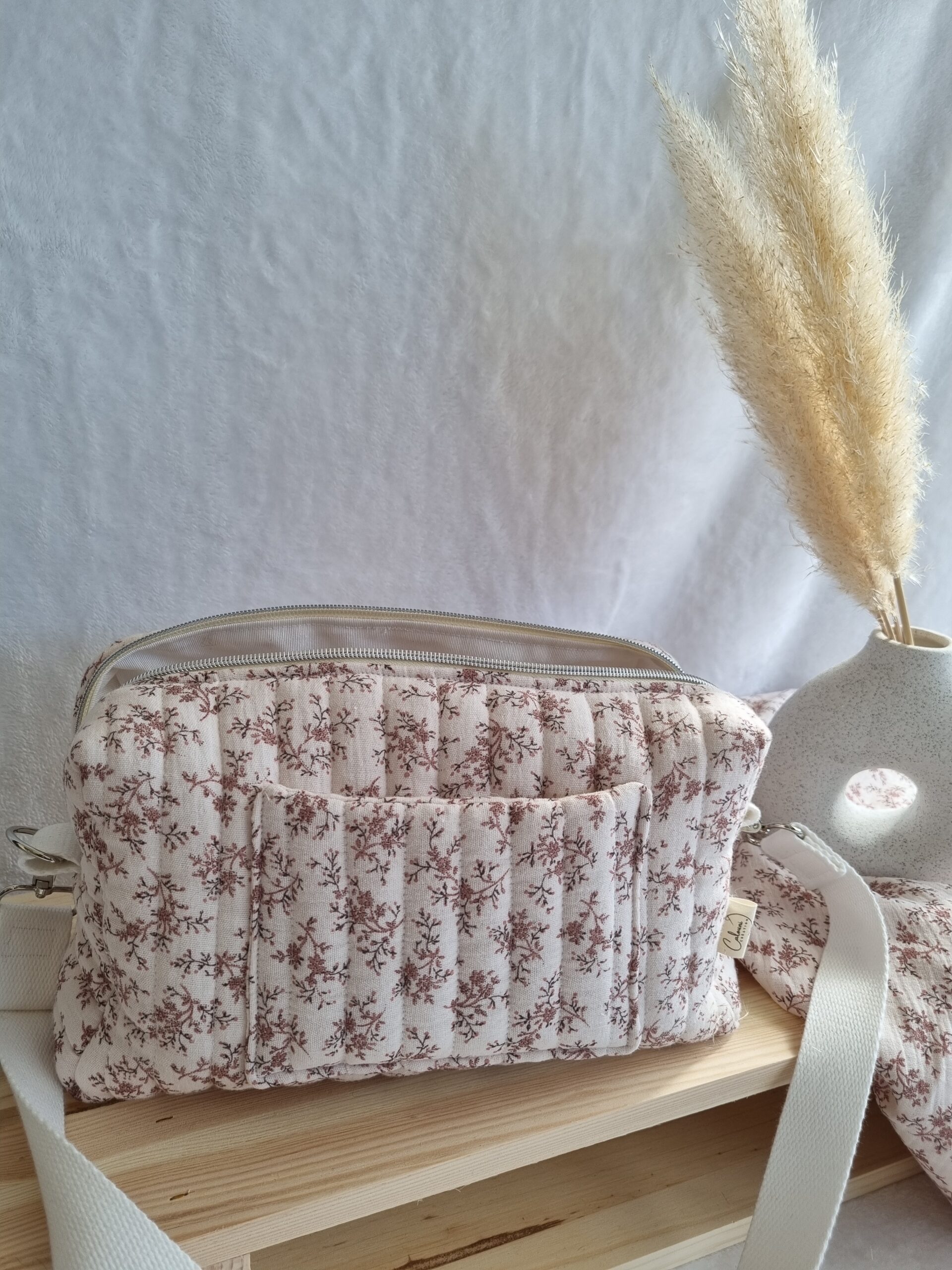 Le motif extérieur est en double gaze de coton et l’intérieur en tissu tissé enduit. Elle est matelassée pour une bonne tenue, elle est fermée par fermeture éclair.